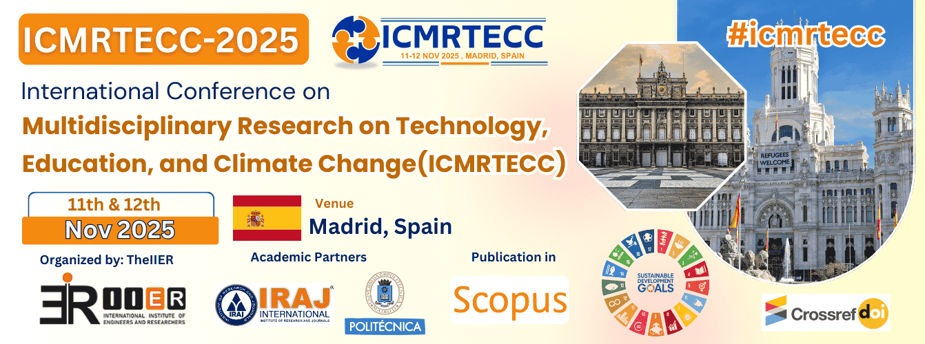 Welcome to the International Conference on Multidisciplinary Research on Technology, Education, and Climate Change (ICMRTECC-2025 ) Organized by TheIIER, in collaboration with IRAJ International and Technical University of Madrid, this prestigious event will take place on 11th–12th November 2025 in Madrid, Spain. Join us for a vibrant exchange of ideas and insights at the forefront of multidisciplinary educational and scientific research. Engage with esteemed scholars, researchers, and practitioners as we explore innovative approaches and emerging trends shaping the landscape of technology, education, learning, and climate change across diverse disciplines.Together, let’s delve into transformative research that inspires and redefines the future of learning and global development.